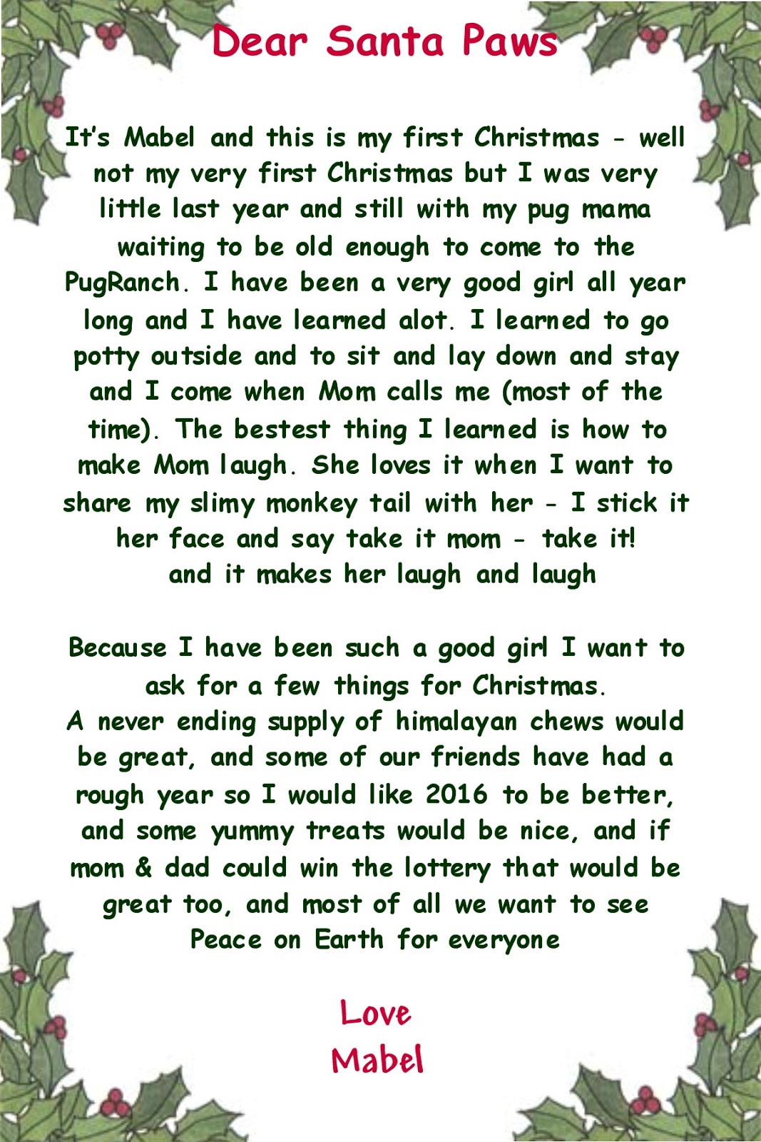 You have given Santa such a beautiful letter, Mabel. We are sure he will try very hard to grant you all your wishes. We hope your first Christmas at the Idaho PugRanch is a wonderful one.